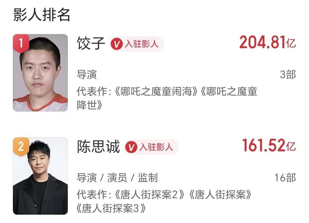饺子导演凭借《哪吒》系列两部电影,执导电影的总票房接近205亿东谈主民币,比陈想诚只多出了40多亿。