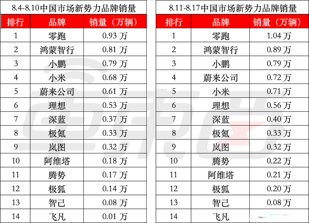具体到新势力榜单层面,2025年8月11日-8月17日,中国市集新势力品牌销量前十四名中,9家新势力品牌上周销量呈现明显增长,它们划分是:零跑、鸿蒙智行、蔚来集团、小米、理念念、深蓝、腾势、阿维塔、极狐。