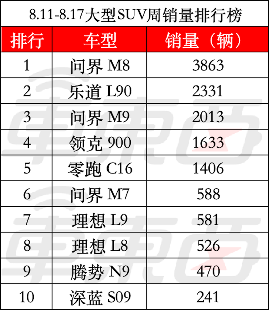 8.11-8.17大型SUV销量(数据源自网罗)