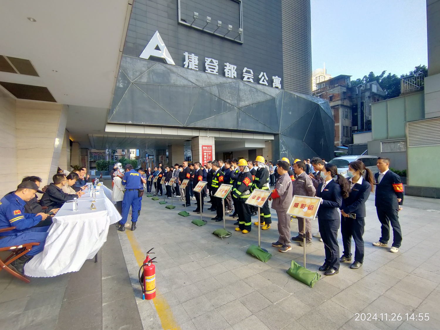 现场率先模拟了捷登皆会6楼西北保藏室位置生气火势较大,1个东说念主使用熄灭器无法扑灭,敷陈消防中心,消防中心值班员运行单元熄灭及东说念主员疏散预案,按照使命主说念主员指令进行疏散,保抓弯腰俯首姿势由最近的安全出口疏散到大地,疏散进程中注意东说念主身安全,请不要乘坐电梯,请按照现场使命主说念主员指引走疏散通说念离开,疏散时请不要拥堵,以免发生踩踏事件。