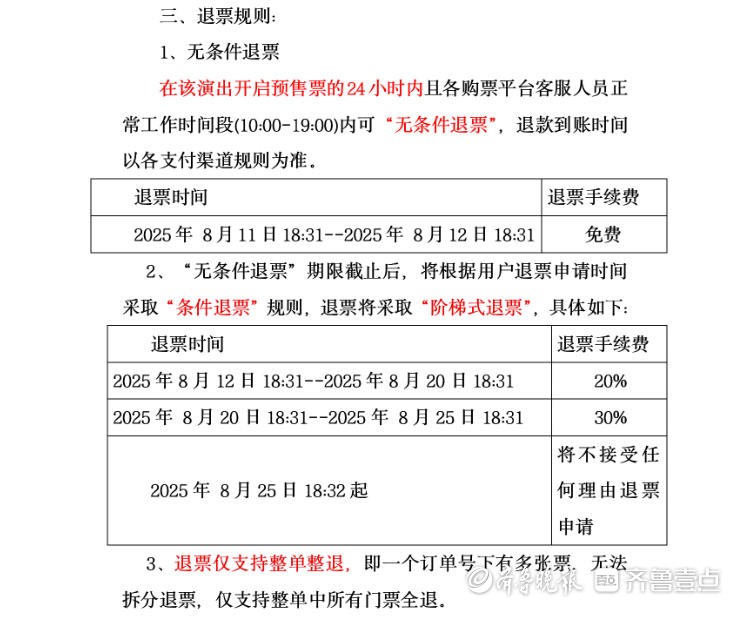 记者查询多个演唱会购票应知发现,绝大多数演唱会章程了“无条件退票”“途径式退票”及“不可退票”时段,其中“无条件退票”时段不收取手续费,“途径式退票”时段凭据退票本事收取比例不等的手续费。即使在可退票期限内,亦有不少演唱会建立了“整单整退”抛弃,这意味着假如蹧跶者购买了多张票,将无法仅退掉其中一部分票。
