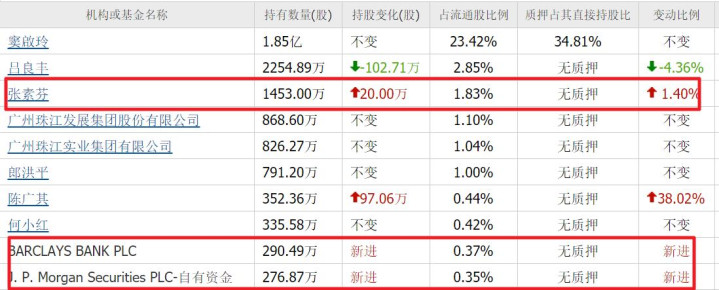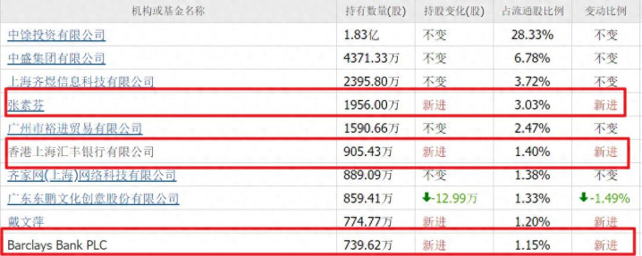 同期,香港汇丰银行,新进905万股;巴克莱银行新进739万股,分辩位列第六和第十大认知鼓励。