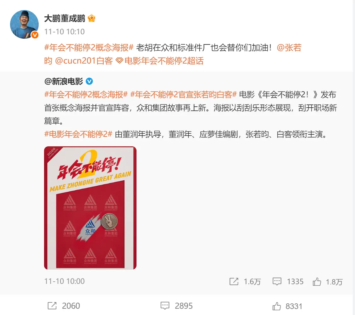 正本《年会弗成停!2》的见地海报和声势发布是11月10日的事儿,滞后上热搜源于三重buff重复: