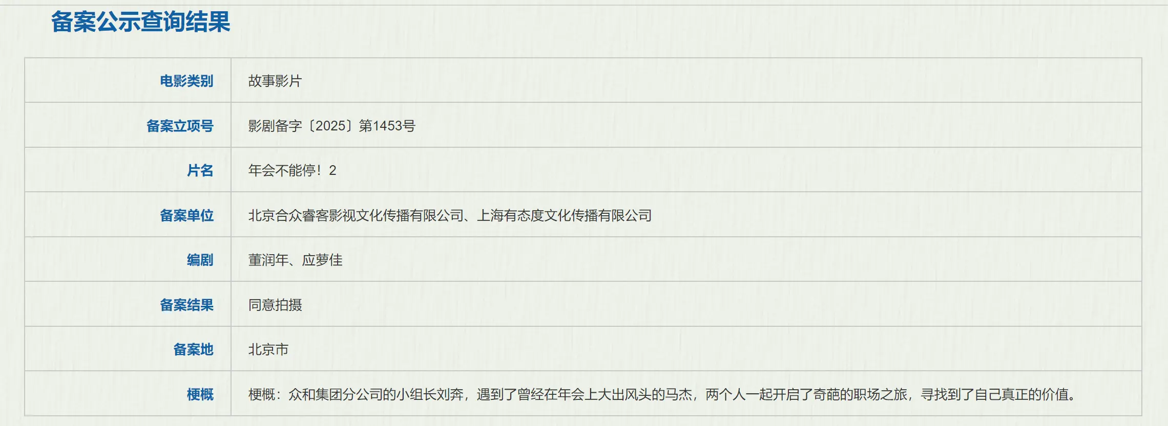 这极少早在《年会弗成停!2》备案公示就有了谜底了。备案单元不是上部主控公司嘉映,而是应萝佳担任法东谈主的合众睿客和有魄力文化,不出不测,这两家将是续集的第一、第二出品方。至于有莫得嘉映很难说,就算有,应该亦然往后排了。到了续集,董润年和应萝佳掌持了满盈的说话权。