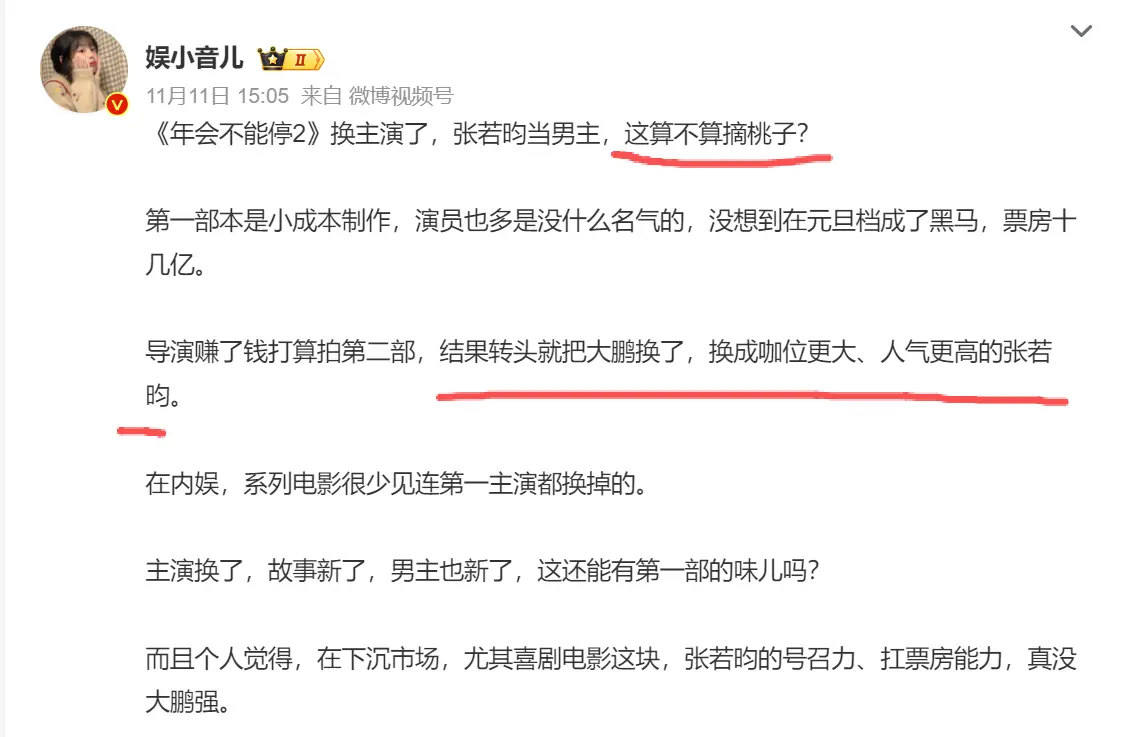 先说论断,《年会弗成停!2》如实资格了成本巨震,在利益驱动下变化很大,但要说张若昀抢了大鹏的主角位置,还真不是这样回事儿。