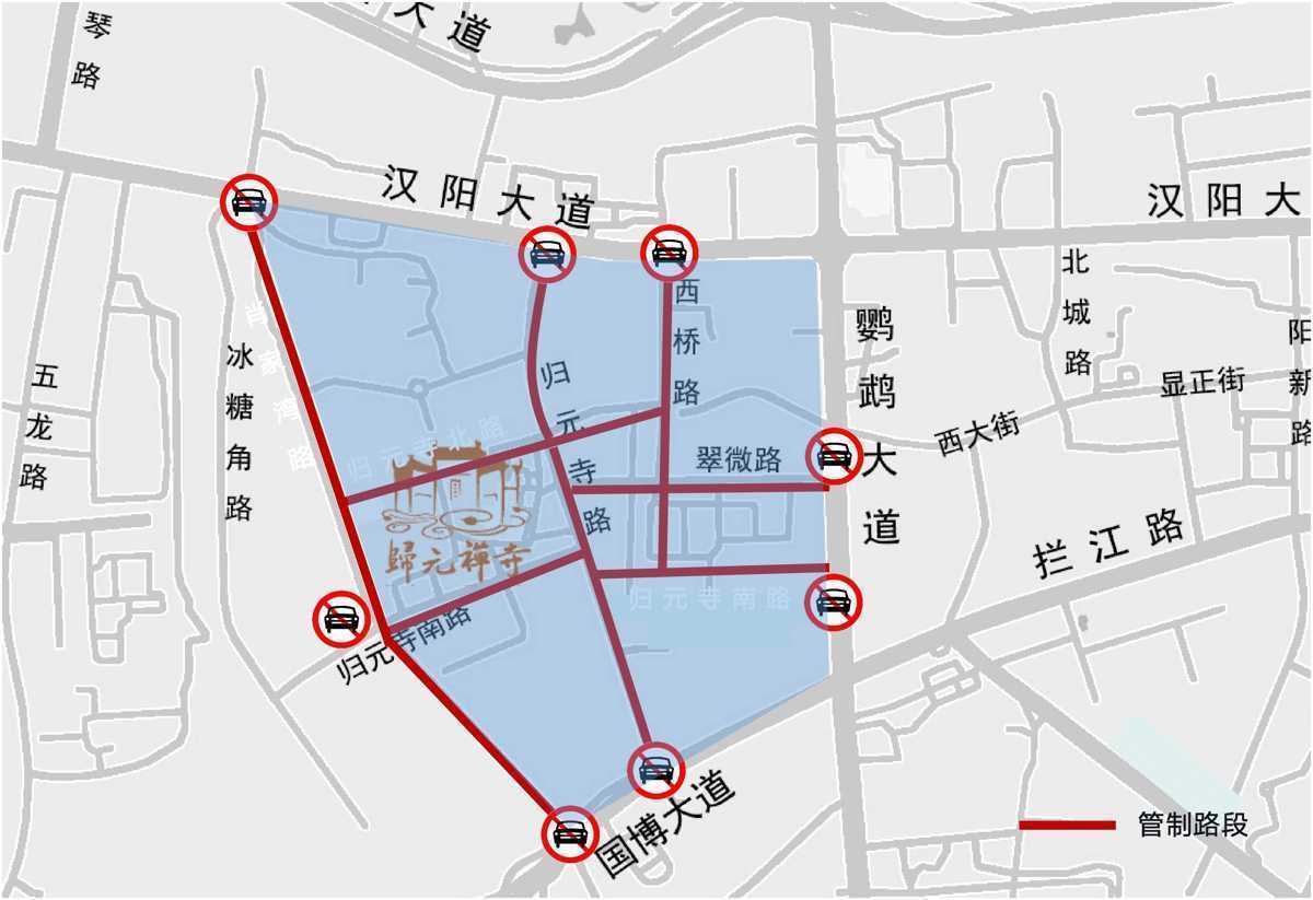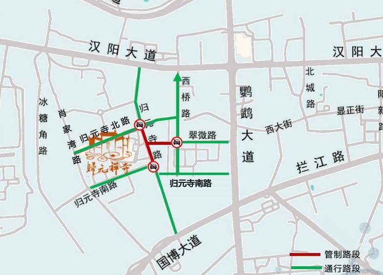 2月18日(初二)、2月19日(初三)、2月20日(初四)、2月22日(初六)、2月23日(初七)逐日7:00至17:00,归元寺路(归元寺南路至归元寺北路)、翠微路(归元寺路至西桥路)阻截生动车及非生动车通行和停放。